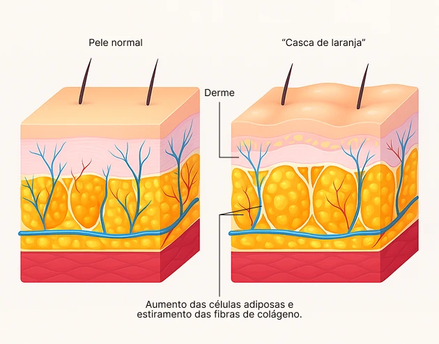 Se forma principalmente na hipoderme, que é a camada mais profunda da pele (tecido subcutâneo), onde estão os depósitos de gordura. A celulite é causada quando essa gordura pressiona o tecido conjuntivo, provocando ondulações na pele (o famoso aspecto de “casca de laranja”).